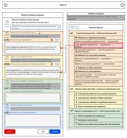 Given that practice is essential to developing metacognitive thinking [], this phase aimed to enable learners to understand the application of EL concepts in their reflective writing. Learners practice reflective thinking through the computerized learning environment. In such an environment, they need to actively practice EL skills by connecting their real-world experience with EL concepts and obtaining support from mentors.