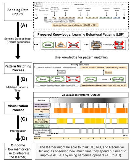 Tanaka et al. [] used EL-guided questions for paper-based reflective writing in EL to train new employees on how to think. In particular, they organized a hands-on, concrete experience (CE) and promoted reflective observation (RO) and abstract conceptualization (AC) to strengthen their understanding. Their study shows that reflective writing improves learning and can be used as a good communication tool between learners and mentors to support the EL cycle. In addition, our pilot study [] developed an online, EL reflective writing system that allowed observations among students, mentors, and faculty allocated to different companies and extended the approach of using EL-guided questions as in [] to help college students improve their business knowledge through an internship program. Both studies found that EL-guided questions for reflective writing can promote learning EL concepts. However, many learners face difficulty applying EL concepts in their daily experiences. Most learners cannot use EL concepts to structure their thinking because they lack the real-world experience of applying such concepts in practice. In other words, the learners cannot connect their CE with abstract EL concepts.