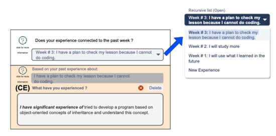 To make learners recognize the importance of the recursive nature of an experience to make a linkage between EL cycles, this function aims to remind learners to apply previous knowledge created from the EL cycle and transfer it to new contexts to create a new experience, as was discussed in Section 2.1.