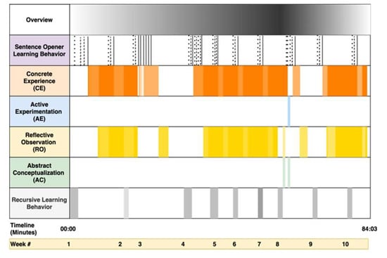 In case study #1, this learner gradually became aware of the EL processes (CE, RO, AC, and AE) with support from the learning environment and their mentor. The visualization in Figure 8 shows the visualization of the learner’s thinking behavior from visualization platform.
