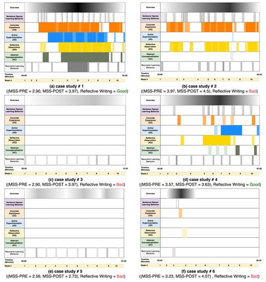 These two case studies show how the learning environment’s functions can provide the data for mentors to offer learners a meaningful interpretation of their learning status. Further, the four more case studies (#3 to # 6) show the different learning processes, various learners’ interpretations from the visualization, and their relationships with the MSS and reflective writing data (details omitted), as are shown in Figure 10. The visualization data was used to show how the learners grasped the EL concepts (process). Contrastingly, reflective writing was viewed as the result (output). The MSS scores were used as an educational tool. Most mentors tended to evaluate learners based on the result [], but the visualization showed their thinking behavior. Therefore, mentors should also monitor progress based on the EL process because it is difficult to judge based on the text alone.