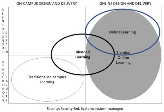 Blended online learning and its relationship to other learning methods (adapted from Power [8] (p. 510), which has a Creative Commons license).