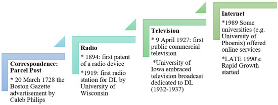 Mitra [7] pointed out that online T and L is rooted in distance learning, a phenomenon with almost 300 years of history (see Figure 2). Distance learning has evolved with improvements to communication technologies, from radio to the internet [9], while it provides equal access to underrepresented groups (non-traditional students as mentioned by [10]. Similarly, Sagun et al. [11] (p. 334) discussed how online T and L supports “disabled students who cannot physically attend in the classroom” and inclusiveness on a sociological level. Miller and Lu [10] reported many advantages of OL courses for non-traditional students before the pandemic (such as working students and people from lower economic classes) and their contribution to growing enrolment.