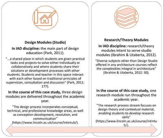 Accompanying design modules, the aforementioned research module is taught throughout the academic year (see Figure 3), and it succeeds research modules of the first and second years (the course’s website: https://www.lincoln.ac.uk/course/intintub/ (accessed on 12 December 2022)). It includes theoretical knowledge alongside research skills, through which students are asked to underpin their design process/outcomes with systematic research, and end with a submission of an academic research study as a written document with rich visuals corresponding to the IAD discipline (the course’s website: https://www.lincoln.ac.uk/course/intintub/).