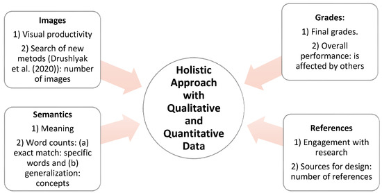 Moreover, the research question (with sub-question 5) examined the relationship between performance, visual productivity and engagement with research within the research/theory module. For that purpose, students’ final grades and the number of images (tables, drawings, etc.) and references were analysed, first with Pearson correlation and then Multiple Linear Regression. Final grades represent overall performance (i.e., [41]), which might be affected by images and references in the written work of students. Visual productivity “is associated with the search for new methods of solving problems” [42] (p. 151) and emerges from the human brain [43] (p. 251). Since in the scope of this study other aspects of images (forms, colours, etc.) cannot be analysed, the number of images were analysed to investigate visual productivity. Engagement with research is an essential part of the design process and an inseparable element of good design practice [44]; in this module, students’ grades are inherently related to their research activities; therefore, a connection between engagement with research and their overall performance was investigated through the number of references as quantitative data. All these elements provide a holistic approach to students’ outcomes and explore the design/research process for IAD with performance, visual productivity and engagement with research, and they underpin the comparison of the 2020 and 2021 year groups’ semantic analyses (see Figure 4). This holistic approach, which embraces the triangulation of the data, ensures credibility in architectural research studies [44,45].