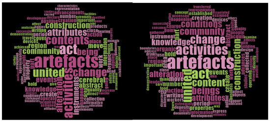 Table 1 presents the only eight concepts that did not appear in the first one hundred terms for one of the groups after the first word count analyses. Figures and words for numbers are excluded, such as 2019, five, etc., for generalisation analysis, whereas only figures are excluded, such as twenty-five, for exact analysis. Moreover, the first 1000 terms of the initial analyses were word counted again by a generalisation feature. Table 2 presents the first 20 terms in which only ‘cerebral’ is not matched to the rest of the list. Word clouds were created after these analyses, presenting common concepts (see Figure 5). These results show that there are strong design-related elements that students embraced: artefacts, activities, content, etc., which were affected by neither the change in learning methods, nor the pandemic.