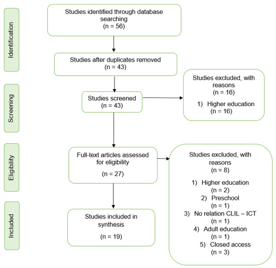 In the second phase, articles were analysed by their title, abstract and keywords, which led to 13 duplicates and the exclusion of 16 articles that were not in accordance with the inclusion criteria of primary and secondary education. Then, these excluded articles focused on preschool level, higher education and adult education. Moreover, another article did not put forward a relation between the topic ICT and CLIL.