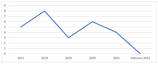 Focusing on date of publication, there was an increase in 2018 (six articles) [54,55,56,57,58,59], followed by a decrease in the number of later studies up to the current date. Although the last years seemed to turn to a higher publication of articles on this topic [35,44,45,46,47,48,49,50], the interest in the use of ICT in the CLIL classroom was in decline. Yet, it is still worth considering that this tendency will continue throughout 2022 and the ensuing years (see the next Figure 2).