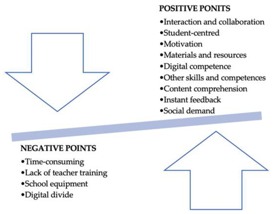 On the other hand, some negative aspects have been recognized since students may have a low level of command of the language of instruction or it may result in subject content loss [31]. This may be due to the fact that teachers need to attend to two curricular goals (subject content and language of instruction), what may result in a slower teaching. Another negative point is the digital divide [32]. In low educational stages it is easy to find students from different backgrounds and needs. Thus, it is not appropriate to conduct a proper online digital CLIL, but to introduce and combine different digital technologies.