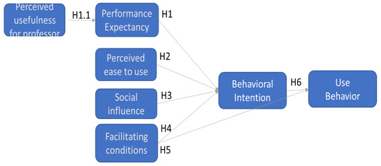 These hypotheses were elaborated based on the conclusions drawn in the extant literature on the application of UTAUT to e-learning acceptance, particularly during the COVID pandemic [35,36,37,38,43,44,45,46,47,48,49,50,51,52,53,54,55,56,57,58,59,60,61]. Indeed, most of the experiences represented in the literature validate the cause-effect relationships between the main constructs of the UTAUT model. Hypothesis H1.1 was drawn as a result of the qualitative study conducted as part of this research, which is described in Section 3.2.