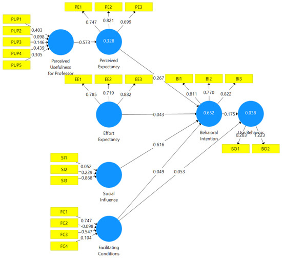 SmartPLS model. Load/weight values per indicator. Path coefficients between indicators. Within the R2 constructs. Source: own elaboration.