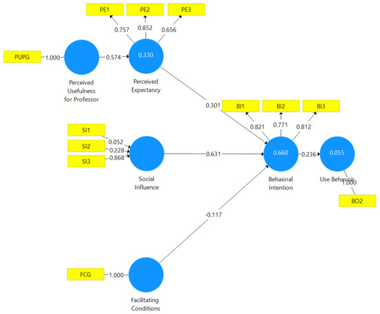 According to these criteria, the only formative indicators left were those for Social Influence (SI). The next step was to analyse the collinearity between them. VIF values < 3.3 indicate an absence of collinearity. Relevance and significance were then analysed. Given that the weights of the indicators decrease as they increase in number, the maximum possible weight value for each of the three SI indicators was 1/√3 = 0.58. The absolute importance of a formative indicator comes from its external load (loads come from simple regressions of the constructor with its indicators). Therefore, when the external weight of an indicator was not significant, the external load was analysed. If it was also below 0.5, its statistical significance was then analysed by applying the bootstrapping technique to more than 5000 samples. Doubts arose with respect to SI1, as it had the lowest external load, and its absolute contribution was 0.338 (below 0.5) and was not significant, but at the same time, it had no collinearity (VIF < 3.3) and was conceptually relevant [77]. See Table 3.