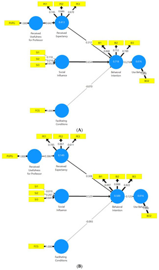 The most important factor determining the intention to use (BI) was Social Influence (SI). When analysing the SI indicators (SI1, SI2 and SI3), it is worth mentioning the enormous weight that opinions from social and professional networks had in determining the intention to use e-learning. Social networks and professional forums are, therefore, key tools for developing a positive attitude towards e-learning by students in the current situation. This should lead to a reflection on the permeability of professors and higher education institutions to tool choices coming from professional or social networks. This is, in general terms, consistent with results found in previous research dealing with the application of UTAUT to e-learning acceptance during COVID-19 in very different regional contexts [43,46,49,50,54,60]. However, it is possible to mention some exceptions, as a similar study focused on a developing country found that social influence did not affect students’ acceptance of e-learning [52]. This seems to imply that the impact of social influence on e-learning acceptance in the pandemic context could be context-dependent.