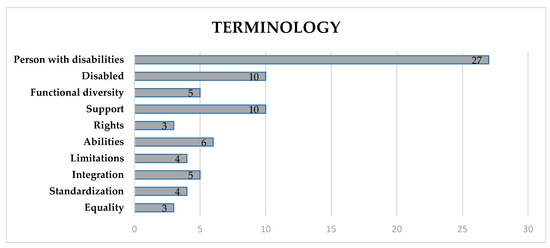Other interesting terms were observed, such as those referring to help, support for people with disabilities, used by 10 students. This concept of help is related to a paternalistic, charitable vision of disability and assistance and far from the concept of rights of people with disabilities. This concept, that of rights, was barely used by three students. Moreover, it was observed that six students spoke of abilities, a relatively current term, which refers to highlighting, naming, and enhancing what each person has, to the detriment of what they lack, that is, focusing on what they are capable of doing, what qualities and values they have, instead of what their shortcomings, deficits, or limitations are [31]. In contrast, the concept of limitations was used by four students. Other concepts that appeared are integration (five students), normalization (four students), and equality (three students) (Figure 1).