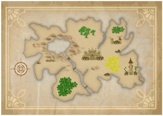 In The Legends of Elendor, students were given the virtual map (See Figure 1). In each session, they could access different quests from the narrative related to the curricular content studied in the classroom.
