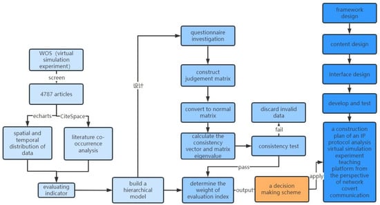 This study aims to construct an evaluation model based on virtual simulation experimental teaching, which involves knowledge from various disciplines such as computer science, education, management, and statistics. Firstly, a co-occurrence analysis of 4787 pieces of literature, including 68,306 citation records, was conducted using CiteSpace software to visualize the historical evolution of virtual laboratory teaching and its research frontier hotspots. The key factors influencing virtual simulation experimental teaching are derived by observing the node information and the information visualization theory with knowledge measurement. A preliminary structural model is obtained based on their attributes and relationships. Secondly, based on AHP, 842 questionnaires were designed and collected. The evaluation model of the hierarchical virtual simulation experimental teaching platform was established through the steps of data matrix processing, consistency test, and index weight classification calculation. Finally, the evaluation model is applied to a specific field. A construction plan of a virtual simulation experimental teaching platform for IP protocol analysis based on the network covert communication perspective is proposed. The framework structure of this study is shown in