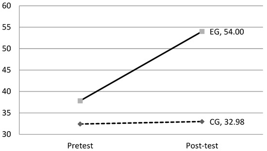 Before the two-way ANOVA was conducted, Box’s test of equality of covariance matrices was run. The result showed that the observed covariance matrices of the pretest and post-test scores were equal across two groups (Box’M = 3.408, F = 1.102, p = 0.347). Two-way ANOVA was, therefore, performed to test for interaction effects between the two groups (EG and CG) and the two testing times (the pretests and post-tests) with respect to News English learning performance (Figure 2). A significant interaction effect was identified between the groups and the testing times (F = 23.088, p = 0.000), indicating a significant difference in the pretest and post-test scores between the two groups (Table 2).