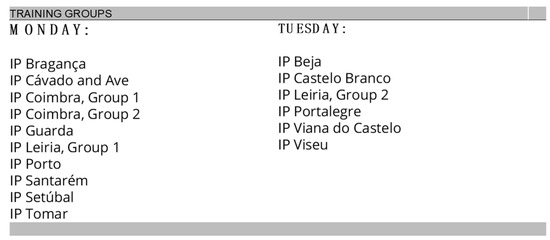 From September 2021 to June 2023, six actions are to be completed, each consisting of eight HEI teachers and two vocational schoolteachers. At the Polytechnic Institutes of Coimbra and Leiria, the number of teachers doubles per action. The training contents are the same in all the polytechnics and Demola trainers have been holding online sessions on Mondays, for one group, and on Tuesdays for the group to which the Polytechnic Institute of Viseu belongs, as we can notice in Figure 1.