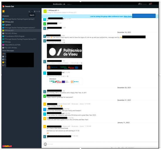 Demola trainers use several platforms to make sure the aims are successfully accomplished. For example, Demola Chat is a collaboration platform with several channels (Demola trainers and all polytechnic institutes’ trainees, Demola polytechnic-specific afternoon trainer and trainees, trainee/facilitator and his/her team of students, and partner organizations) for users to communicate securely in real time while participating in a Demola challenge (cf. Figure 2). Demola Atlas (https://atlas.demola.net/ (accessed on 28 July 2022)) is another platform that enables each trainee/facilitator to manage contracts, the different tasks of the team, evaluations, and results, as Figure 3 shows. The students use the Demola Portal (https://portal.demola.net (accessed on 28 July 2022)) to apply, submit their tasks, and manage their participation in the project Link Me Up—1000 Ideias.