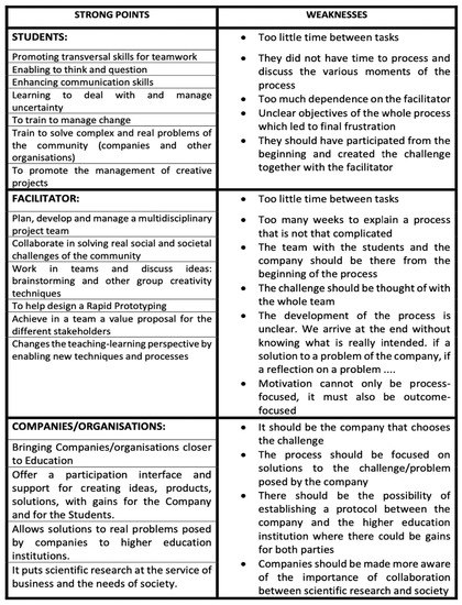 Similar constraints and drawbacks had also been identified by trainees/facilitators from the first batch, and Figure 4 below, which was the conclusion of one of the e-portfolio reports, lists the strong and weak points of the training program, which, except for some personal interpretations that are not reliable accounts of what really happened (e.g., the objectives are well-defined from the beginning, the challenge is designed by the trainee in consultation with the company’s representative and the students are involved as soon as everything is set, it is clear that the team are allowed to choose whether they want to follow a solution-based approach or a description of future scenarios, and there are already agreements being signed at the beginning of the process between each company, the polytechnic institute, and the students, etc.), in one way or another were also shared by the majority of the participants: