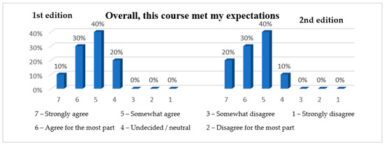 According to a 7-point Likert scale, majority of the respondents claimed that the course met their expectations, with just 20% being undecided in the first batch and 10% in the second. The second edition showed better results, probably stemming from adjustments to the training program.