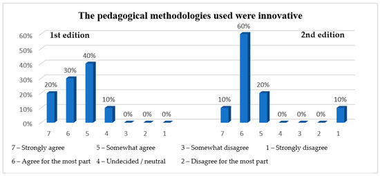 If we dive deeper into the participants’ level of satisfaction, we find out that 90% of the respondents agreed, though at different levels, that the pedagogical methodologies were innovative. If, in the first batch, the highest percentage (40%) somewhat agreed with the assertion, followed by 30% of respondents that agreed with it for the most part, and 20% that strongly agreed with it, in the second batch the major percentage (60%) agreed with the assertion for the most part, followed by 20% that somewhat agreed with it, and 10% that strongly agreed with it. The remaining 10% in each edition revealed that one teacher was undecided/neutral on the topic in the first edition, while in the second there was a teacher that strongly disagreed that the methodologies were innovative (Figure 6).