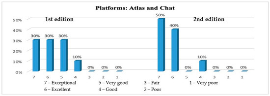 The respondents’ perspective on the platforms used, such as Atlas and Demola Chat, drew consensus from the two groups (Figure 7), despite being more valued by the participants in the second batch, following the same trend thus far.
