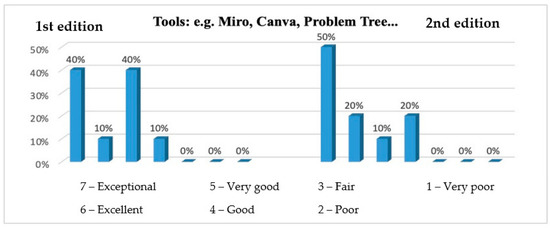 The tools, particularly Miro, Canva, Problem Tree, and PESTLE analysis, among others, are recognized as essential to the process of facilitation and to tackling the challenges being worked on, resulting in even more positive feedback, as shown in Figure 8.