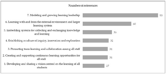 Thus, it was confirmed that the extent to which the seventh dimension is implemented can be observed in the manifestations of the other six dimensions in real processes taking place in the school. From the analysis of the interviews, it was identified that in the schools represented in the interviews, the seventh dimension is most evident in the manifestations of dimension 6 “Learning with and from the external environment and larger learning system” (n = 23) in relation to the initiatives of school representatives in establishing cooperation with non-school institutions such as companies, and initiatives to learn from other organizations, for example, in collaboration with universities. The seventh dimension was least identified (n = 5) in the interviews with school staff on the implementation practices of dimension 5 “Embedding systems for collecting and exchanging knowledge and learning” in their schools.