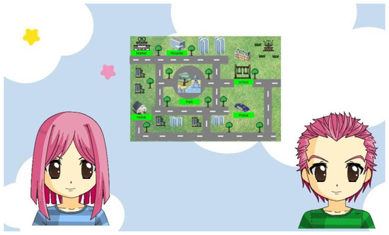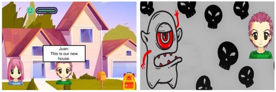 Kiddo is a narrative and decision-making or “game thinking” videogame used to address gender stereotypes for school-aged children (9–13 years old). Kiddo seeks to make the most common gender stereotypes visible so as to educate about equality. The story takes place in common scenarios in a child’s development: school, home, park, etc. The main characters of the game are two twins (a boy and a girl) who encounter situations related to gender stereotypes that they must overcome without hurting themselves or the other twin. In these scenarios, the twins, Juan and María (see Figure 1), engage in conversations and interactions with other characters (NPC/non-playable) within the game. The game has a mood bar, where players can observe how the character feels about the decisions made.