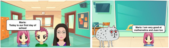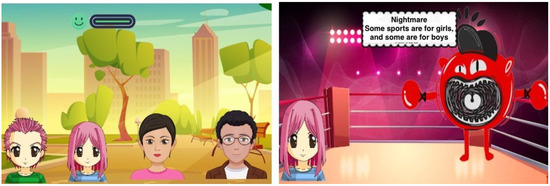 In the third chapter (see Figure 5), players face another crossroad, this time at the elementary school, where the art and science fair is taking place. In this chapter, Maria’s wish is to participate in the science area; however, the teacher has decided to divide the group in two based on the students’ gender. Particularly, the teacher explains to female students that it is better for women to participate in areas traditionally closer to their sex, such as art, while for boys, the teacher tells them that it is better for them to compete in science and mathematics. During this chapter, players have to face different opinions about this stereotype, while the teacher is still rooted in the old stereotype “boys are better in math and girls are better in arts”. The children have to face these stereotypes with the help of their classmates, so as to try and change the way the twins will participate in the fair.