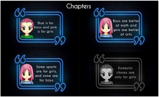 Players play from a third-person perspective, achieving immersion in the game through elements such as narrative, character design, and the use of common environments for the players, which can help increase a sense of empathy and closeness in a player. The game contains four chapters (see Figure 2) addressing different gender stereotypes: