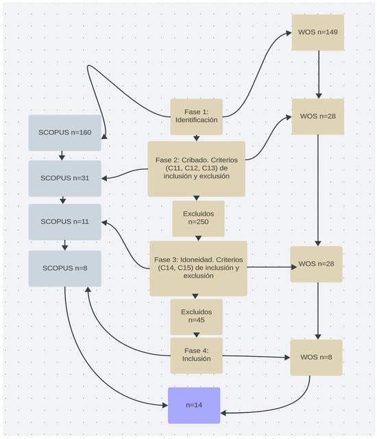 Firstly, the initial search for results was conducted in the WoS and Scopus databases based on the application of the search equation. In the second phase, inclusion and exclusion criteria related to document typology, availability for consultation, language, and study type were applied. Finally, in the third phase, each title and abstract of the articles were analyzed in detail based on the remaining inclusion and exclusion criteria (Figure 1).