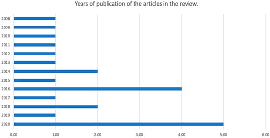 Regarding the publication periods (Figure 2), it can be observed that a significant portion of the articles published on intergenerational learning occurred during the year 2020, with a total of five publications, followed by the year 2016, which had a total of four publications. In the other years, there were two publications in 2014 and 2018, and the remaining years had only one article each.