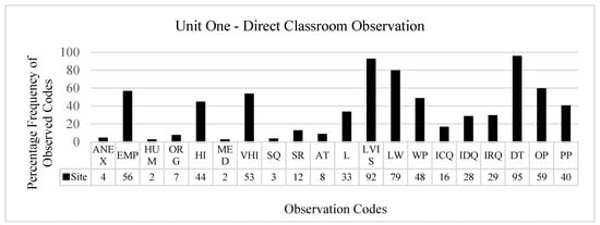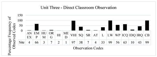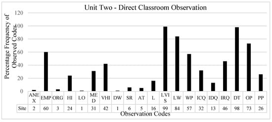 In this unit, the primary means of presenting information to the students was the professor writing on the chalkboard while lecturing. As can be seen from Figure 3, the chalkboard (CB) was used for 99% of the observed time, as well as a 99% frequency of the lecturing while writing (LW) code. Contrary to the other two units, student engagement was significantly higher, with very high (VHI) engagement being observed for 97% of the time intervals. In addition, there were more observed instances of student questions (SQ) at 38% and student response (SR) at 7%. Another interesting observation was the high level of instructor comprehension questions (ICQ) posed, which was observed for 63% of the time intervals. This indicates there was more student–instructor dialogue than in the other two units observed. There was also more time spent emphasizing (EMP) concepts, at 66% of the observed intervals, which can be attributed to the increase in the dialogue with students.