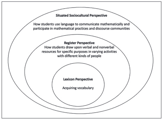Figure 1. Moschkovich’s perspectives on the relationship between language and mathematics [52] p. 179.