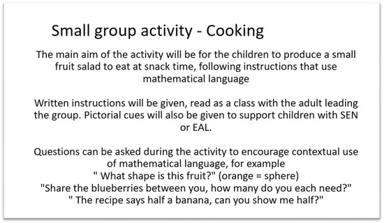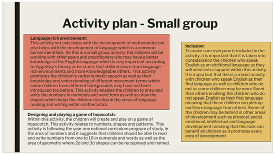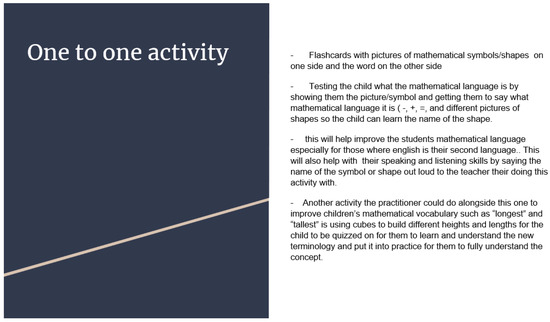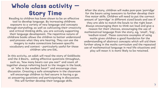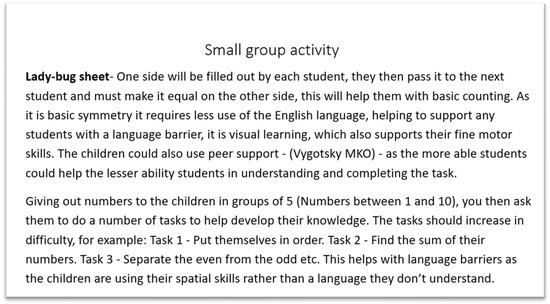 Most students perceived the use of multi-sensory approaches, such as incorporating songs, the use of various manipulatives and representations including concrete materials (e.g., Numicons, Unifix cubes) and visuals, the use of play, especially in outdoor learning environments and cooking. Repeated rationales of those practices include making real-life connections, encouraging communication, and also addressing language diversity. However, there were cases where some groups attempted to use such approaches to minimize language-related demands to make the content ‘accessible’ for everyone. This is also a reflection of an approach that sees ‘language as a barrier’, and subsequently some groups proposed their solution as using language less. For example, G11 attempted to use visuals, potentially gestures, and body movements to create opportunities for addressing language diversity in their small group activity (Figure 6). This resonated with other small group activities in the cohort and resembled another mainstream activity that can easily be found online. Their suggested practice remained limited, and in fact, problematic, as the main aim appeared to be minimizing language exchanges. This was particularly evident in the following quotation: ‘This helps with language barriers as the children are using their spatial skills rather than a language they don’t understand’. Although embodied activities have the potential to address language diversity [50], it is imperative to explore prospective teachers’ rationale and enactment of proposed practices in real life.