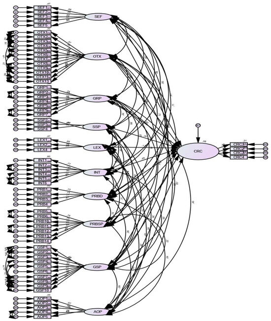 The assessment of the validity of the hypothesised model in Figure 1 produced a chi-square value of 2905.017 and 1997 degrees of freedom. The associated p-value was less than 0.005 (p = 0.00). The CMIN/df = 1.455 and, based on the cut-off criteria, indicated a good fit. The value of RMSEA = 0.045 and SRMR (0.046) showed a good fit. Therefore, the measurement model fulfilled the requirements for absolute fitness.