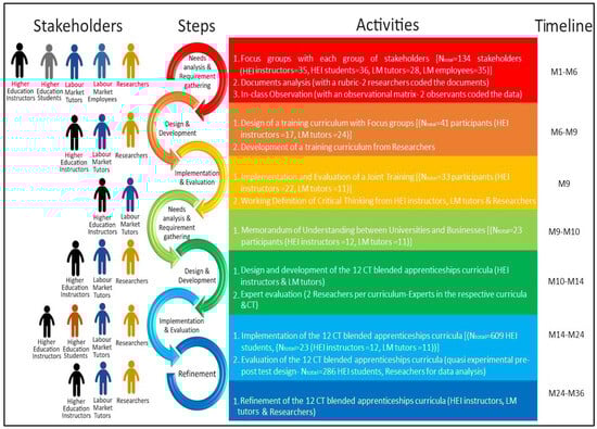 It is crucial at this point to provide more information regarding the actors, namely, the key stakeholders involved in the PC-D methodology. Five HEIs and four LM organisations were engaged in the PC-D. Each HEI was engaged in the PC-D with a team constituted by researchers, HEI instructors, and students. Researchers were previously engaged in research on CT and their role was to safeguard the PC-D and ensure that high research standards were followed throughout the design process of the curricula. Moreover, HEI instructors were among the cornerstones of the PC-D. Their teaching experience varied between 3 to 15 years, while some of them also had limited previous experience with CT. HEI instructors’ role was to provide requirements for their training on CT as well as on the design of the CT blended apprenticeships curricula. Furthermore, they were explicitly engaged in the design, development, delivery, evaluation, and refinement of the curricula. In addition, HEI students were engaged in the PC-D during the first step of the project, namely, the needs analysis and requirements gathering. Students engaged in this step had previously successfully completed the curricula addressed by the project or were graduates. The CT blended apprenticeships curricula were also implemented and evaluated by undergraduate HEI students. In Figure 1, the difference between the HEI students that participated in the needs analysis and requirements gathering step and the step of implementation and evaluation of the curricula is depicted, and students are highlighted with a different figure colour (i.e., orange).