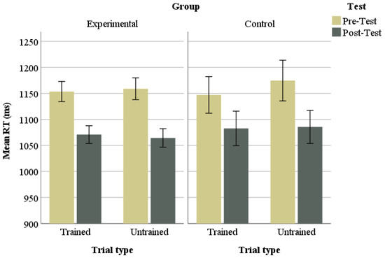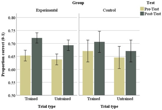 We first assessed whether learning gains could generalize to untrained nonwords by submitting participants’ ABX responses to test items (correct or wrong) to a linear mixed-effects model with a binomial logistic regression (in SPSS 25) with test (pre-test, post-test), group (experimental, control), and trial type (trained, untrained) and their interactions as fixed effects, including a random intercept for subject. These analyses showed significant main effects of test (F(1, 9912) = 19.75, p < 0.001) and trial type (F(1, 9912) = 4.98, p = 0.026), but neither the main effect of group (F(1, 9912) = 0.001, p = 0.977) nor any of the interactions reached significance (see Appendix A for the model’s parameter estimates). Tests of pairwise contrasts showed that while at pre-test the experimental group performed equally well on trained and untrained items (t(9912) = 1.01, SE = 0.015, p = 0.316), at post-test they discriminated the target vowels at significantly higher correct rates in trained than in untrained nonwords (t(9912) = 1.98, SE = 0.014, p = 0.048). This indicated, as expected, that training had a larger effect on trained than untrained nonwords, although both improved significantly between testing times. Interestingly, whereas the experimental group discriminated the target vowels significantly more accurately at post-test than at pre-test in both trained (t(9912) = −5.01, SE = 0.015, p < 0.001) and untrained (t(9912) = −5.01, SE = 0.015, p < 0.001) nonwords, the control group did not significantly improve on either trained (t(9912) = −1.21, SE = 0.030, p = 0.229) or untrained (t(9912) = −0.026, SE = 0.031, p = 0.406) nonwords. These findings indicate that for the experimental group (but not for the control group), discrimination accuracy improved for both trained and untrained nonwords, showing that training gains generalized to untrained nonwords. Consequently, in all subsequent analyses, accuracy and RT scores from test items (including trained and untrained nonwords) were used as dependent measures.