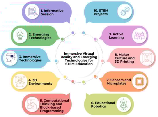 An integrative didactic experience (the “Immersive Virtual Reality and Emerging Technologies for STEM education” course—IVET&STEM course) was designed and implemented, based on the STEM approach, and tailored to improve the digital competencies required for using a range of emerging technologies such as virtual reality, augmented reality, educational robotics, maker spaces, and sensors, among others, as pedagogical resources for STEM education (Figure 1). This course was developed as part of the Proposed Training Actions for the 2021/2022 academic year at the Faculty of Educational Sciences of the Universidad de Granada, with a duration of 50 h, leading to the acquisition of 2 elective credits for the students (out of the syllabus of the Bachelor’s Degree offered in the Faculty: Primary Education, Early Childhood Education, Social Education and Pedagogy).