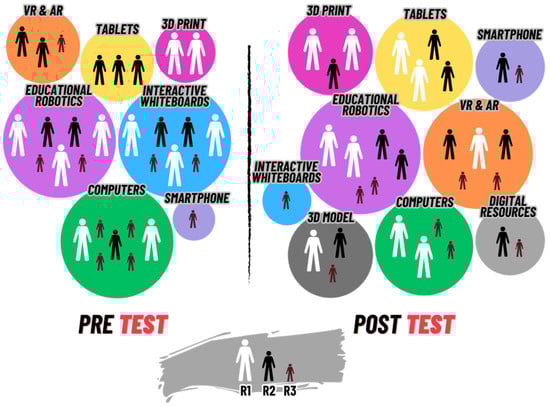 The results for the qualitative section of CUTE-STEM indicate several interesting findings. Regarding the first question (three types of technologies or digital devices in increasing order of importance) (Figure 2), in the pretest, the participants predominantly mentioned traditional technologies like “Ordenador” (Computer), “Robótica” (Educational Robotics), and “Pizarra Digital” (Interactive Whiteboard) as positive for STEM teaching. However, in the posttest, there was a noticeable shift toward more advanced technologies such as “Realidad Virtual” (VR and AR), “Impresión 3D” (3D Printer), and “Robótica” (Educational Robotics), which experienced slight growth. This transition suggests an evolving perspective, with the participants recognizing the potential of immersive and maker technologies in STEM education.