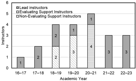 Prior to the 2016–2017 academic year, UMaine Mechanical Engineering operated with a single instructor managing the entire capstone sequence, including all grading and the majority of team advising, save only teams with external clients. With continual enrollment growth over several years, deliverable numbers had been reduced to manage instructor workload. During the 2016–2017 year, the department adopted a new performance-indicator (PI)-based ABET assessment and evaluation system, which resulted in many PIs being assessed in the capstone sequence, requiring a revised number of deliverables. The structure of the course management process is covered in prior publications [,]. This significantly increased the workload despite a temporary reduction in capstone enrollment. New instruction modalities were considered, and the department settled on a configuration with two instructors jointly overseeing all teams, with the goal of reducing the individual workload, increasing project diversity, and ensuring consistent advising. During the following years, a variety of factors, including faculty sabbaticals and changing enrollment, caused the department to explore additional modalities of instructor assignment and student interaction. While these modalities were developed somewhat ad hoc, and they do not exhaustively cover all options, this case study presents advantages and disadvantages of five different modalities implemented over a seven-year period at UMaine. The modalities evaluated are summarized in Table 1, with further details on the motivations and implementation given below. The progression of instructor count is provided in Figure 1.