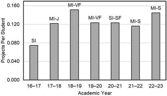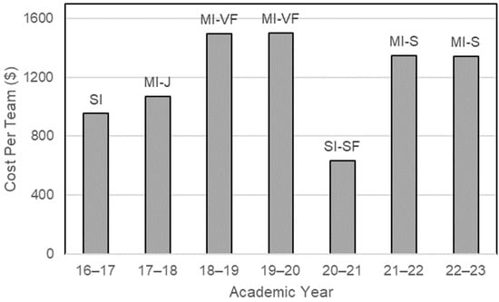 Figure 6 shows the cost per project invested by the Department for each academic year. Data from the 2020–2021 year during the COVID-19 pandemic should not be used to draw conclusions as the build process that year was reduced in scope to deal with public health restrictions. The highest values of cost per team were achieved in years with volunteer faculty, a natural expectation when the instructor team expands and guidance is not as tightly coordinated. With fewer faculty coordinating more closely (MI-J, MI-S models), costs can be more tightly controlled, both through the definition of project scopes, and through careful hardware usage such as common components and standard parts, such as fasteners. The benefits of standardizing project options are evident in the 2016–2017 year (SI model), which achieved the second lowest cost per team behind the COVID-19-restricted year.