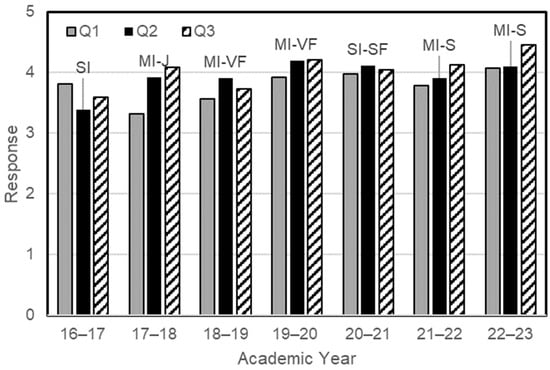 Capstone is a unique experience for most undergraduate engineering students, and can be frustrating, especially for students who are unexpectedly confronted by the need for modern engineering competencies such as managing engineering activities, communication, and lifelong learning. Key drivers to student satisfaction are interest level, driven largely by project topic, perceived grading fairness, manageable workload, consistency of information, and project success [,,,,]. In particular, most capstone experiences do not require a successful project to achieve a high grade and student learning outcomes, but students can be frustrated if the projects are seen as complete failures. The choice of teaching modality can have a major impact on many of the above aspects. Student satisfaction in this case study is evaluated through university-administered student evaluations and through instructor observations. At UMaine, prior to 2019–2020, students completed a 29-question paper questionnaire to evaluate each course and instructor. Starting in 2019–2020, UMaine adopted a 19-question online questionnaire. Many of the questions were identical or near-identical. The results presented in this study focus on three questions which were all identical in the two questionaries. Several caveats must be provided regarding student evaluations. The first is that the data are limited to students who responded. It is possible that, in low-response-rate cases, only data from students with a strong positive or negative experience are recorded. The literature on the topic has noted either minimal impact of selection bias [], or a slight overprediction of true rankings on average [], although the impact of selection bias on a single course is very difficult to predict. Response rates ranged from 33% in 2021–2022 to 73% in 2017–2018. The second is that student evaluation ratings of courses and instructors are known to be influenced by grades given and many other factors separate from the teaching modality [,,]. Hence, instructor observations are included in the following discussion. Finally, the ratings during the pandemic years of 2019–2020 and 2020–2021 may be significantly impacted by the changes that occurred to comply with public health restrictions, including meeting virtually, and reducing hands-on work.