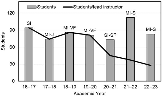 We consider the number of students in project teams managed by an instructor to be a suitable proxy for faculty workload, as shown in Figure 8. Efforts that do not scale with number of students, including lecturing (1–2 h per week) and managing the course webpage, are relatively minor. The typical structure throughout the case study period is for an instructor to meet with each team of approximately five students weekly for 30 min. Approximately, an additional 3–6 h per semester are required for each group for grading deliverables, including reports and presentations. Despite many of the benefits described above, the MI-J and MI-VF modes of instruction do not significantly reduce instructor workload because each lead instructor is still responsible for many contact hours, attending weekly meetings with all teams, and for reviewing major deliverables from each team. The SI-SF model in 2020–2021 was introduced as a means of reducing lead instructor workload by delegating responsibility for weekly meetings and deliverable grading to support faculty. While these workload aspects were significantly reduced, this modality created a burden on the lead instructor to train and coordinate support faculty, especially considering the complex assessment requirements for ABET, which was equally time-consuming compared to advising teams directly. While it is likely that the training effort would decrease in subsequent years, it is also likely that the support faculty members will rotate in and out, minimizing the training reduction. During the three years with support faculty in some capacity, the overall burden on the lead instructor workload did not noticeably decrease. This modality was also quite burdensome on the Department. While only a single lead instructor was assigned to the course, the Department considered the effort of support faculty in course assignment, and paid an overload fee for the participating support faculty members.