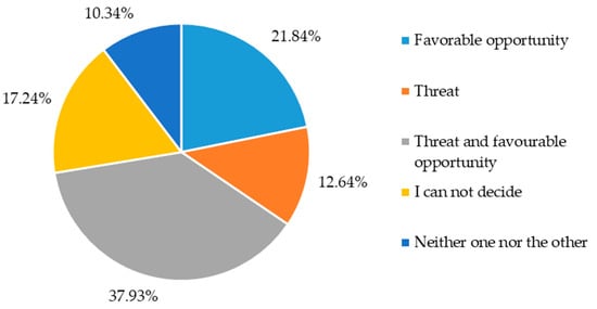 ChatGPT is a new tool, and its capabilities and impact on education are still being explored. The university professors are not yet familiar with it and cannot decide whether it would be a threat or a beneficial opportunity. There are concerns that AI will replace educators [37], but depending on how it is applied, it is possible to turn any threat into an opportunity. The majority of respondents of the current study consider ChatGPT as an opportunity, and its application in education would support their teaching activities, both in preparing materials and generating new ideas to make learners more active.