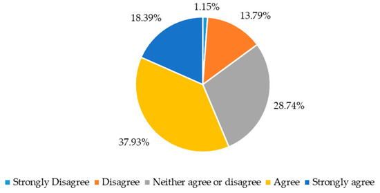 The university professors have a relatively positive attitude regarding the implementation of ChatGPT in their teaching practice (M = 3.14, SD = 0.954), with 41.4% of respondents answering agree or strongly agree (Figure 2). The share of university professors who cannot decide whether to apply this new technological tool in their teaching activity is relatively high (35.63%).