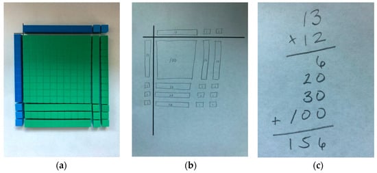 One instructional approach that uses concrete models, such as manipulatives, is the concrete–representational–abstract (CRA) approach, which is sometimes referred to as the graduated instructional sequence or the concrete–pictorial–abstract approach. The three parts of the CRA instructional approach build upon each other. The CRA sequence begins with students using the manipulative as they work on a task (i.e., the concrete stage). Once students master the concrete stage, they can create a pictorial display of a completed task with the manipulative (i.e., the representational stage). In the last stage (i.e., the abstract stage), students use numerical or algebraic symbols to facilitate abstract reasoning [20]. For example, students could use base-ten blocks to display a multidigit multiplication problem at the concrete stage, a drawing of the base-ten blocks to comprise the representational stage, and Arabic numerals and symbols to show the same problem during the abstract stage (see Figure 1).