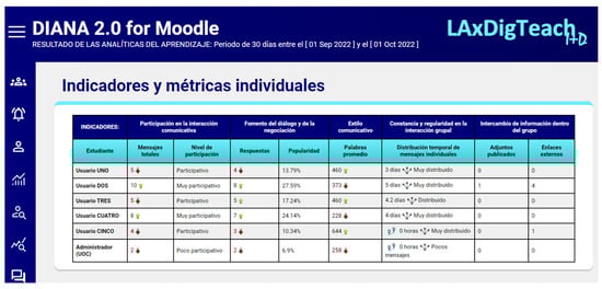 According to the previous context, in this article, we show the results of applying a tool designed for the Moodle environment (DIANA) where the contributions are oriented in the field of improvement in the teaching–learning experience itself through an appropriate design of the subject that affects the personalization of learning. Furthermore, this experience also makes an approach toward the assessment and evaluation of online learning. At the end of the day, this study is framed in the project “Use of learning analytics in digital environments: impact on the improvement of university teaching practice” (LAxDigTeach-21085GE), where one of the objectives is to analyze the academic impact of applying learning analytics in university digital environments.